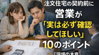 注文住宅 注文住宅の契約前に営業が「実は必ず確認してほしい」10のポイント【現場の本音】 注文住宅の契約前、「聞いてない」「想定外の追加費用」で後悔する人は少なくありません。現役の注文住宅営業が、契約前に施主側から必ず確認してほしい10のポイントを現場の本音で解説します。 2026.01.08 注文住宅