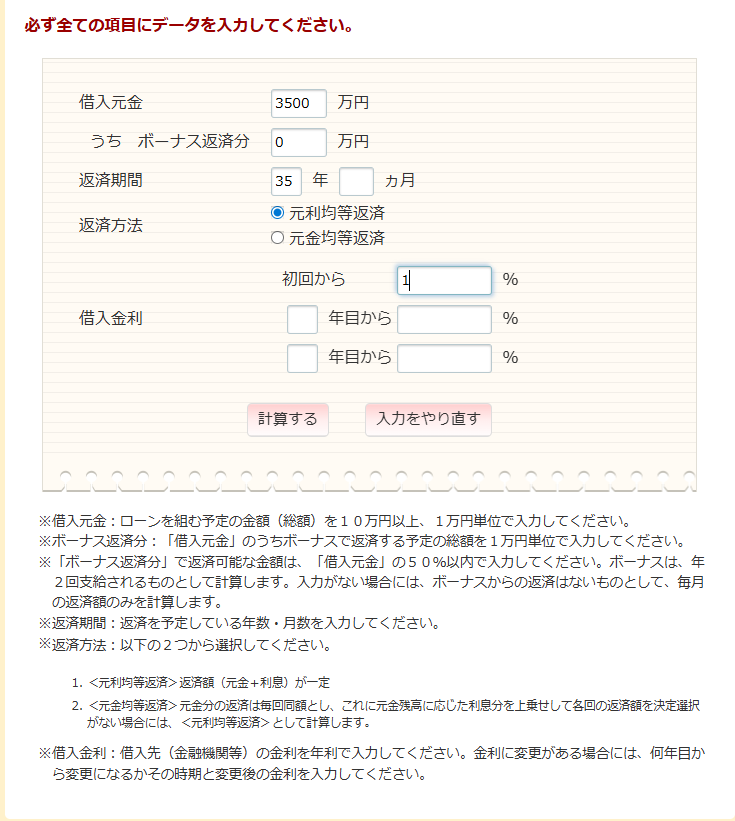 金利はとりあえず1%、返済期間は35年で行うのが一般的な目安ですね